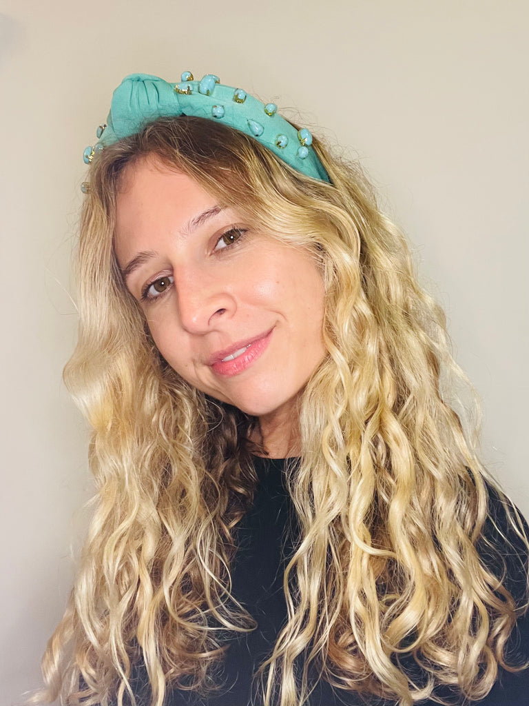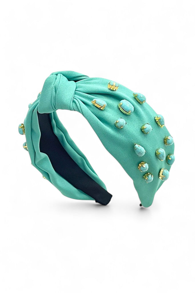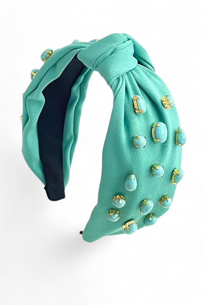 Our Joshua Tree Turquoise Alice Band features crepe fabric knotted in the center and dotted with stunning turquoise gems. Striking on any hair colour and complexion, this piece is a true conversation starter with its unique colour and use of turquoise.